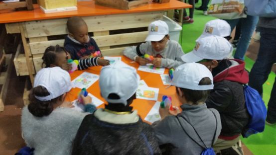 Les enfants des centres aérés affluent à notre stand pour découvrir les abeilles, déguster les miels, fabriquer des bougies en forme de lapins et de poules ainsi que colorier les dessins