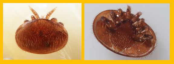 La femelle mesure entre 1.1 et 1.8 mm de long sur 1.5 à 2 mm de large et est de couleur marron.
